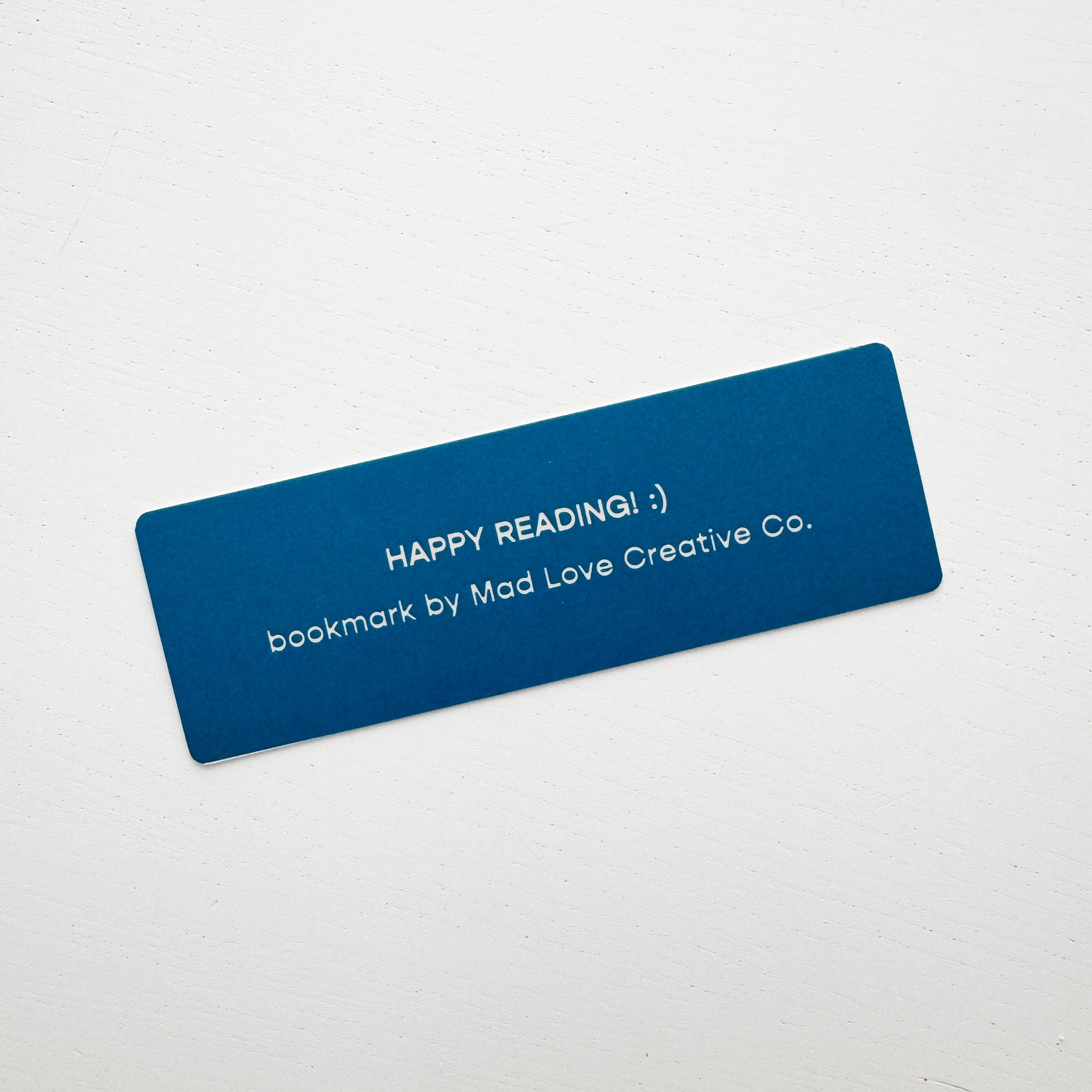 The backside of the bookmark is a solid colour with text that says "Happy Reading! :) Bookmark by Mad Love Creative Co."