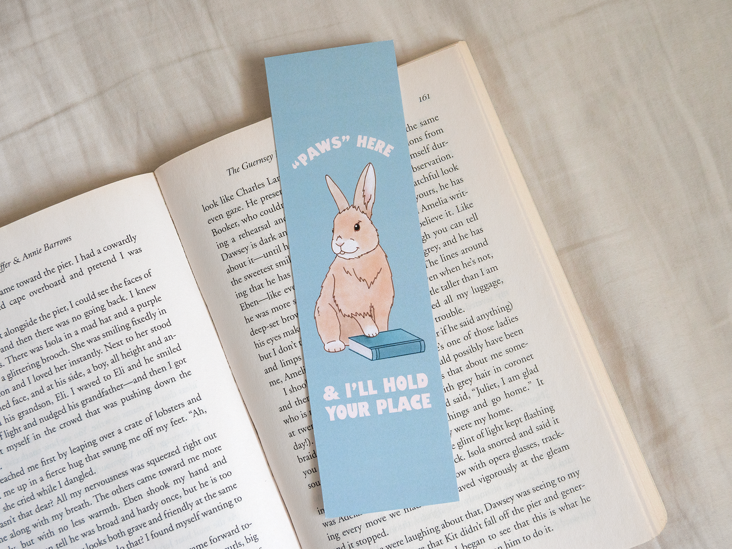 Available in four colours, this cute bookmark features a hand-drawn bunny illustration and a punny saying, "'Paws' here & I'll hold your place".
