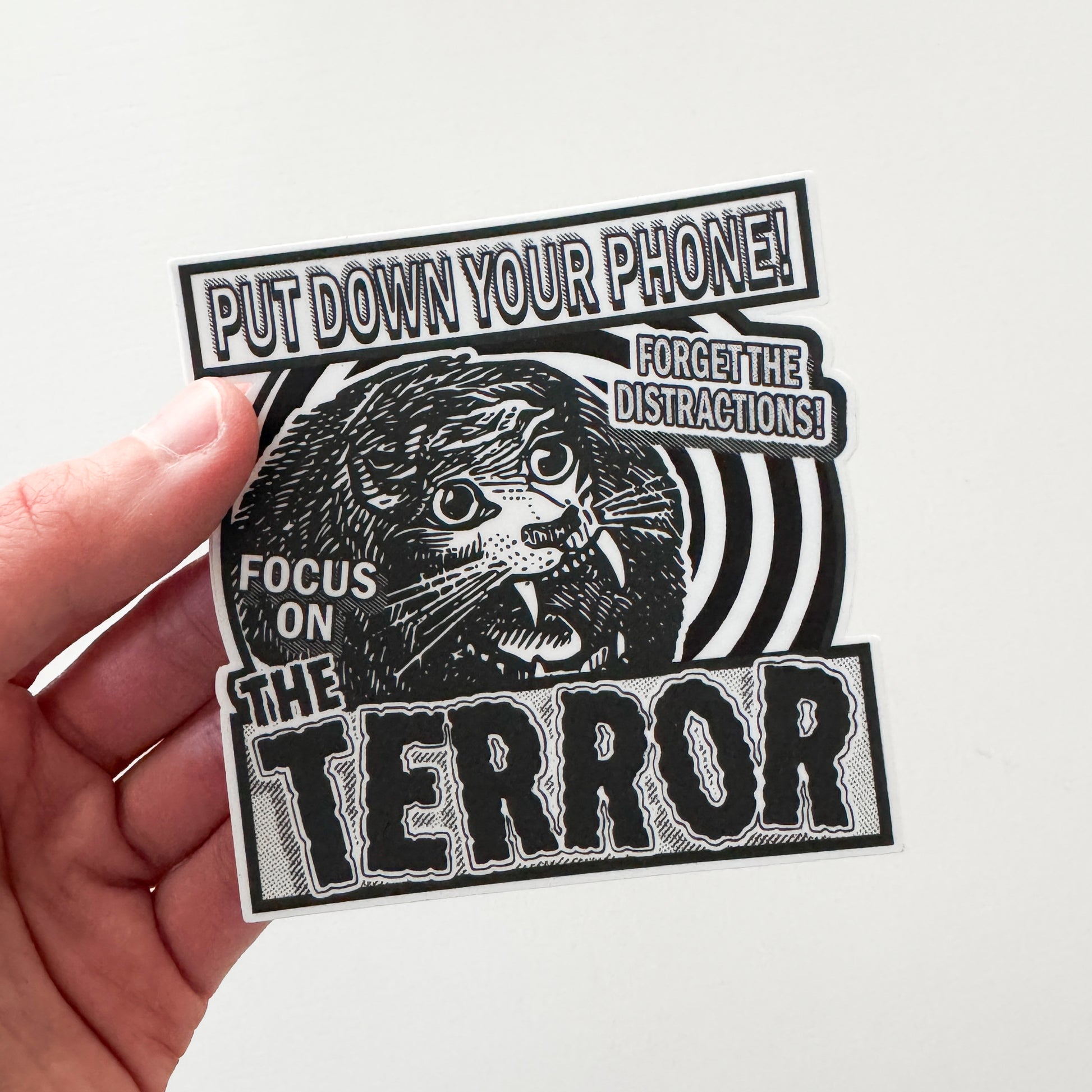 We live in a age of constant distraction, which is pulling our attention away from what really matters: the terror. Also the horror. If you are old-fashioned and like to face the horror of a meaningless existence head-on, here is a sticker to help remind your to stay on task.