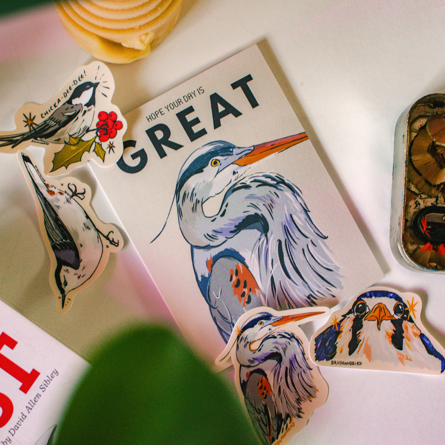 Bring a touch of quiet grace to your assortment with our Great Blue Heron sticker.
