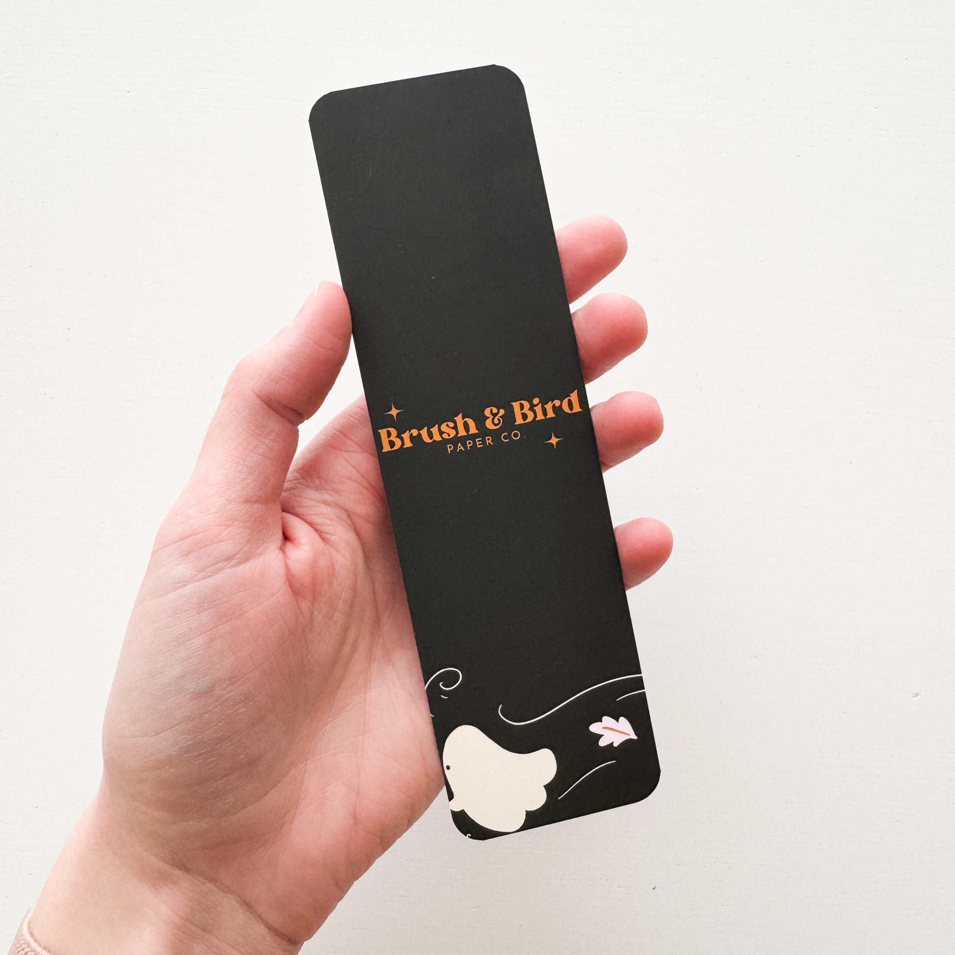 A cute bookmark with an adorable little ghost pattern! The back is matte black with branding and small illustration at the bottom