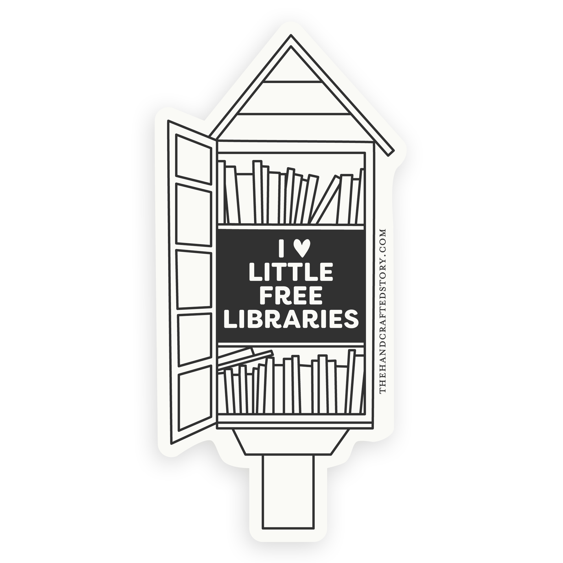 A black and white drawing of a little free library filled with books and the words "I 🖤 Little Free Libraries".
