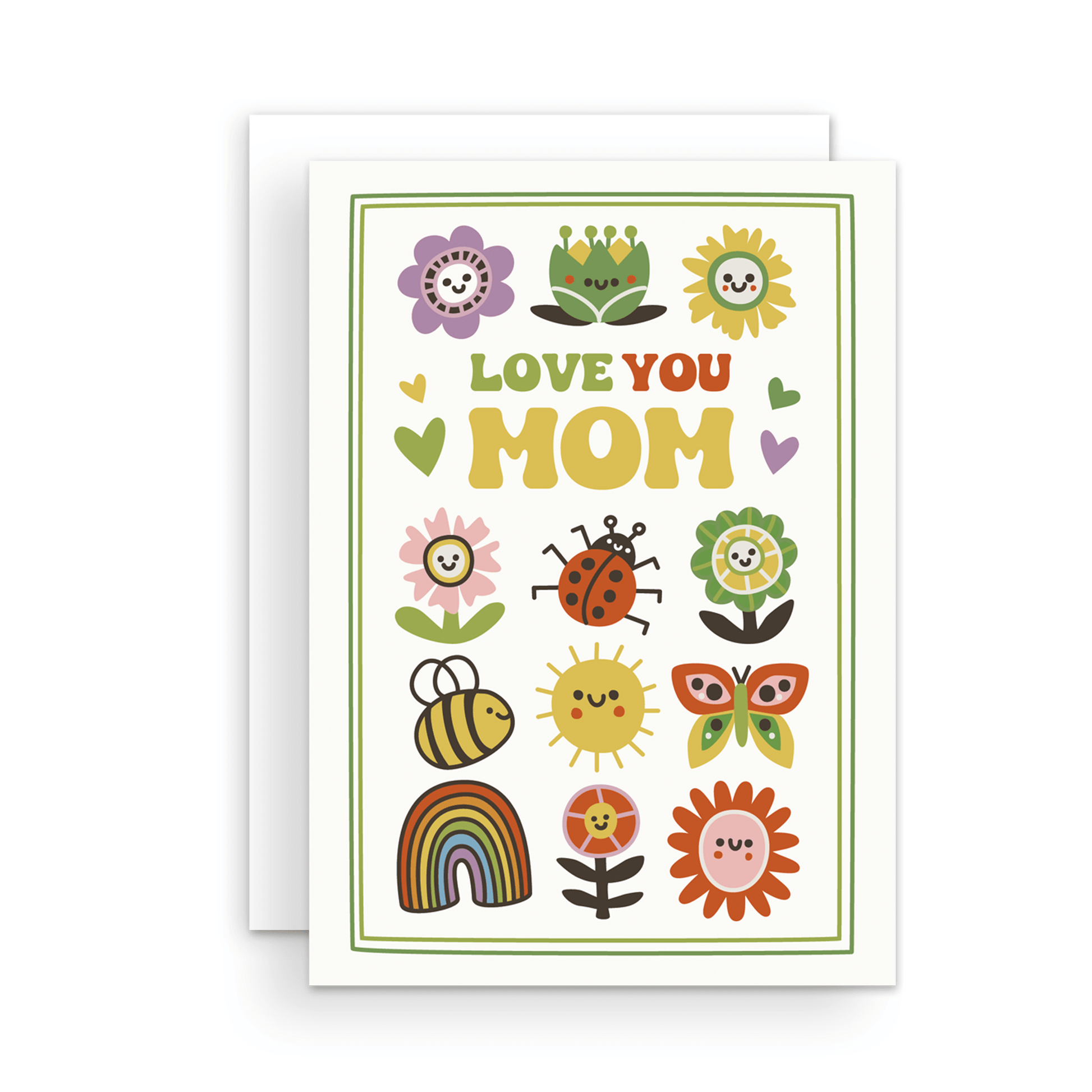 A cute and colourful card to celebrate your Mom, with flowers, a ladybug, bee, butterfly, rainbow and sunshine.