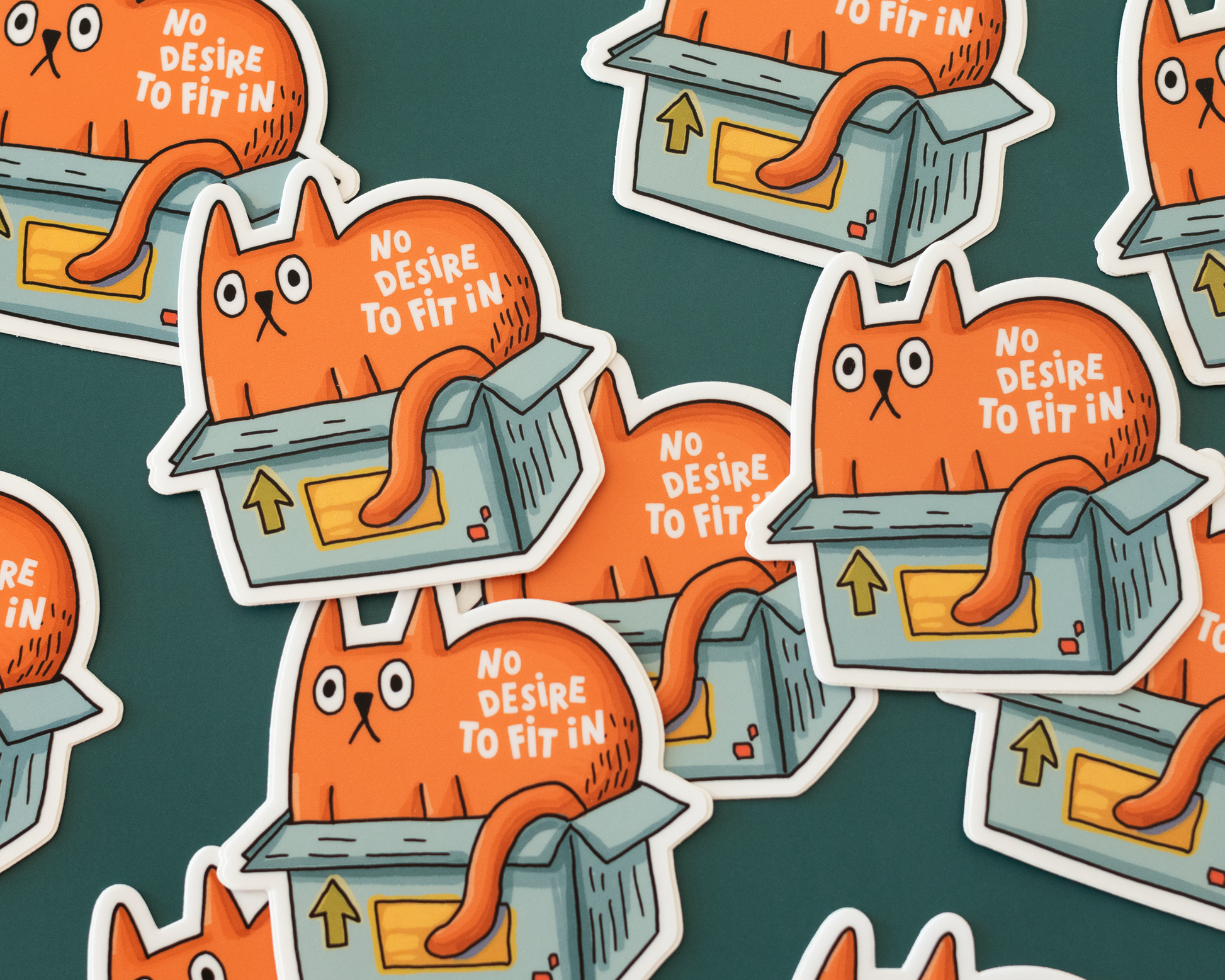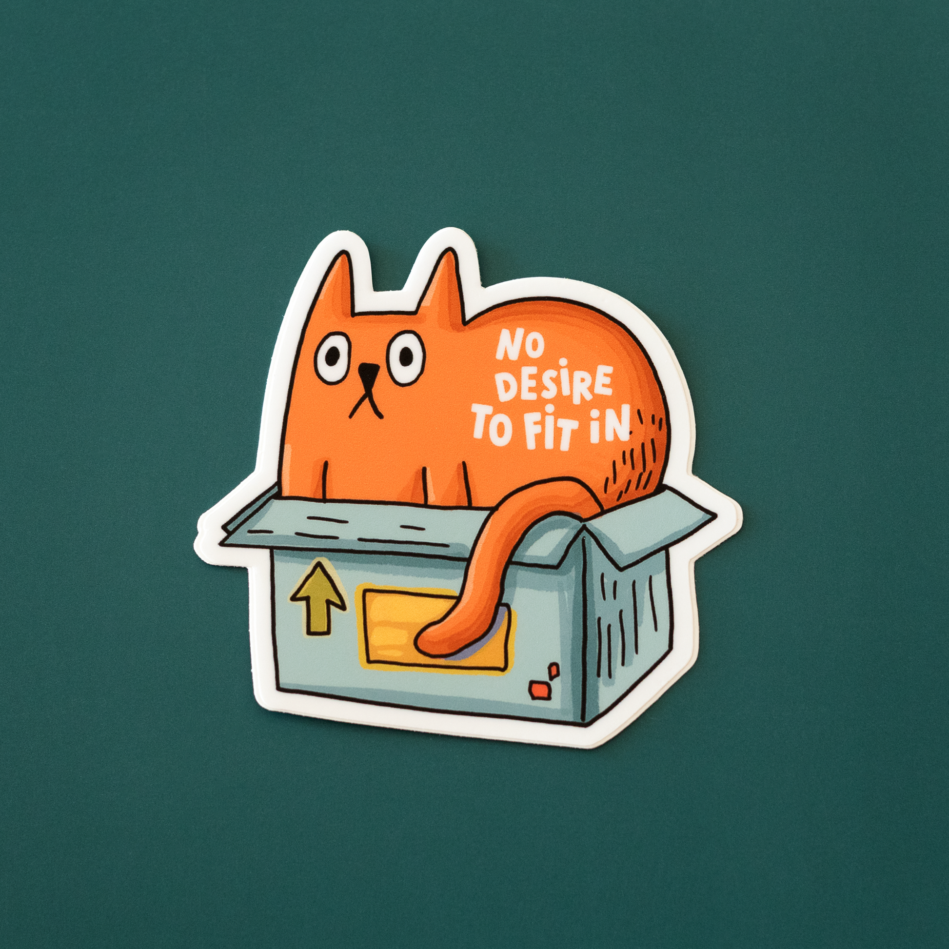 An illustrated vinyl sticker featuring a defiant orange cat lounging in a box